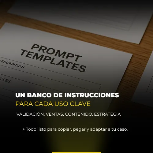 Te damos prompts listos para usar, estructurados y aplicados a negocio, contenido, decisiones, validación y más. No te vas a quedar en blanco.